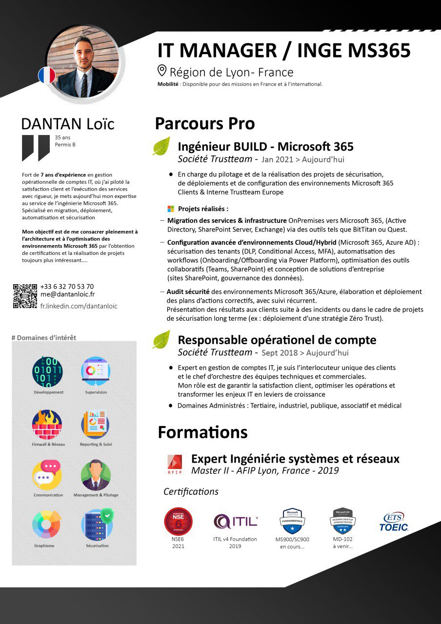 Passionné par les technologies cloud Microsoft, je me spécialise dans la conception, le déploiement et l’optimisation d’environnements Microsoft 365 pour les entreprises. Fort de plus de 3 ans d’expérience dans l’accompagnement de migrations complexes et la gestion de tenants, je combine expertise technique et approche consultative pour renforcer la confiance des clients et la sécurité des différents environnements interconnectés.